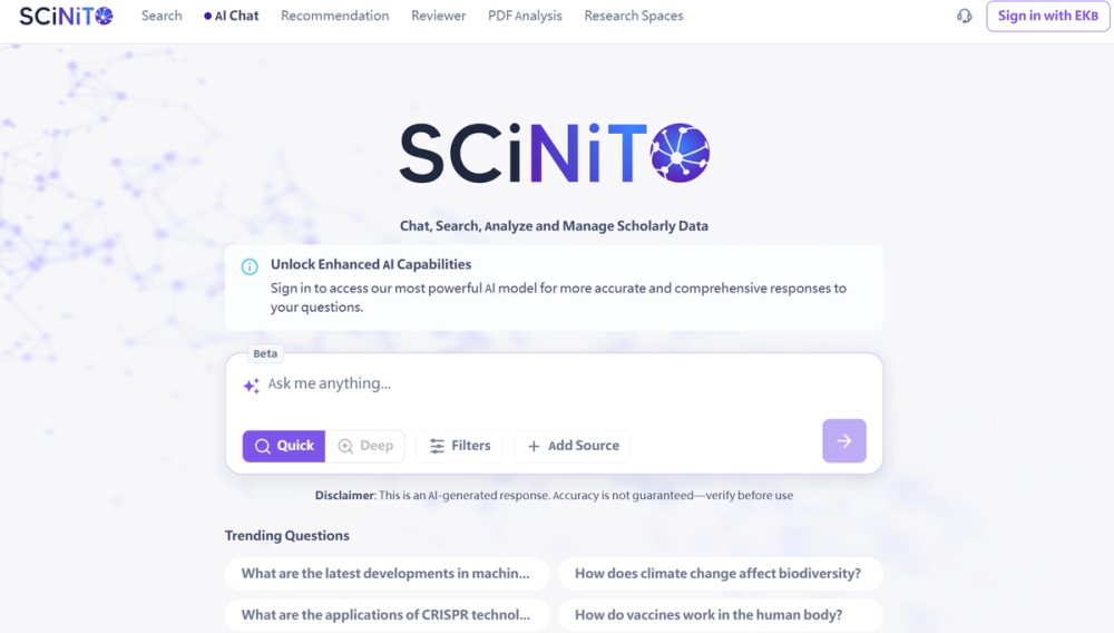 Scinito is a dedicated "Research Chatbot" that reads, analyzes, and cites millions of academic papers so you don’t have to manually trawl through PDFs. The best part? You can use the core search engine endlessly for free, though the actual AI chat features come with a daily cap that resets every 24 hours.